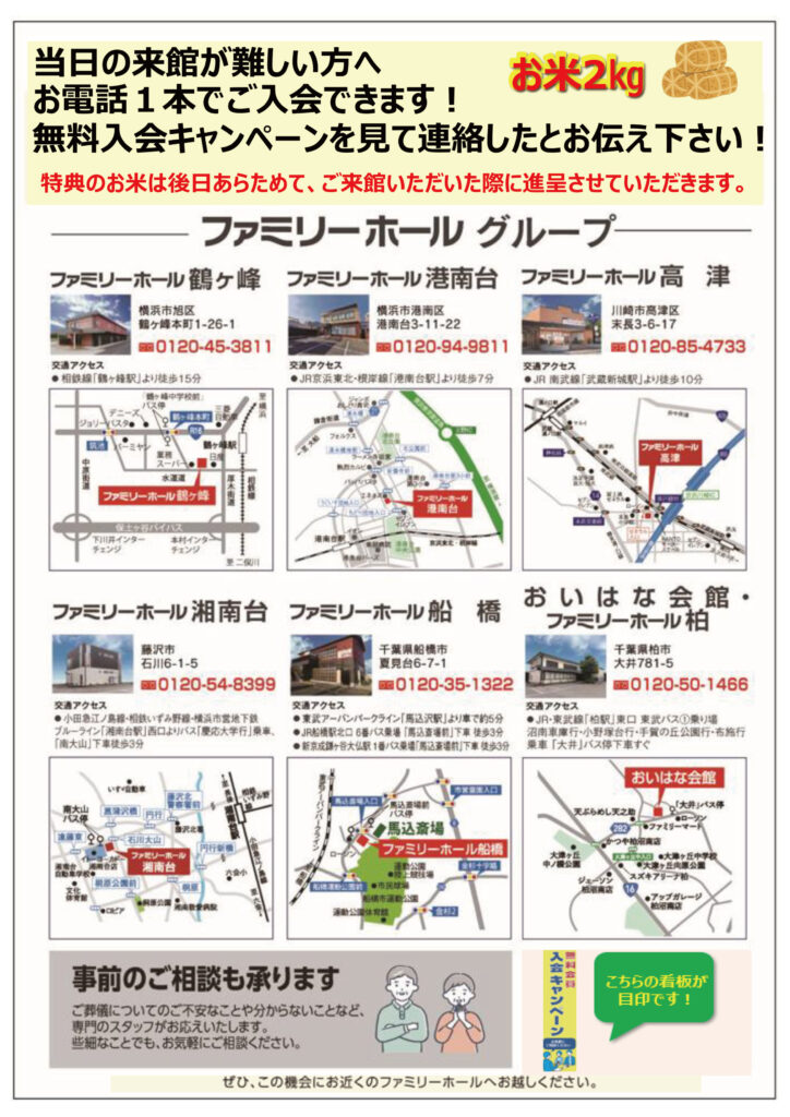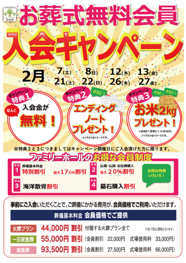 2/7(土)、8(日)、12(木)、13(金)、21(土)、22(日)、26(木)、27(金)限定で、入会金無料に加えてエンディングノート、お米2㎏をプレゼントいたします。