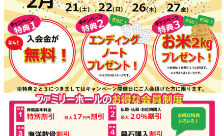 【お葬式無料会員入会キャンペーンのお知らせ】2/7(土)、8(日)、12(木)、13(金)、21(土)、22(日)、26(木)、27(金)